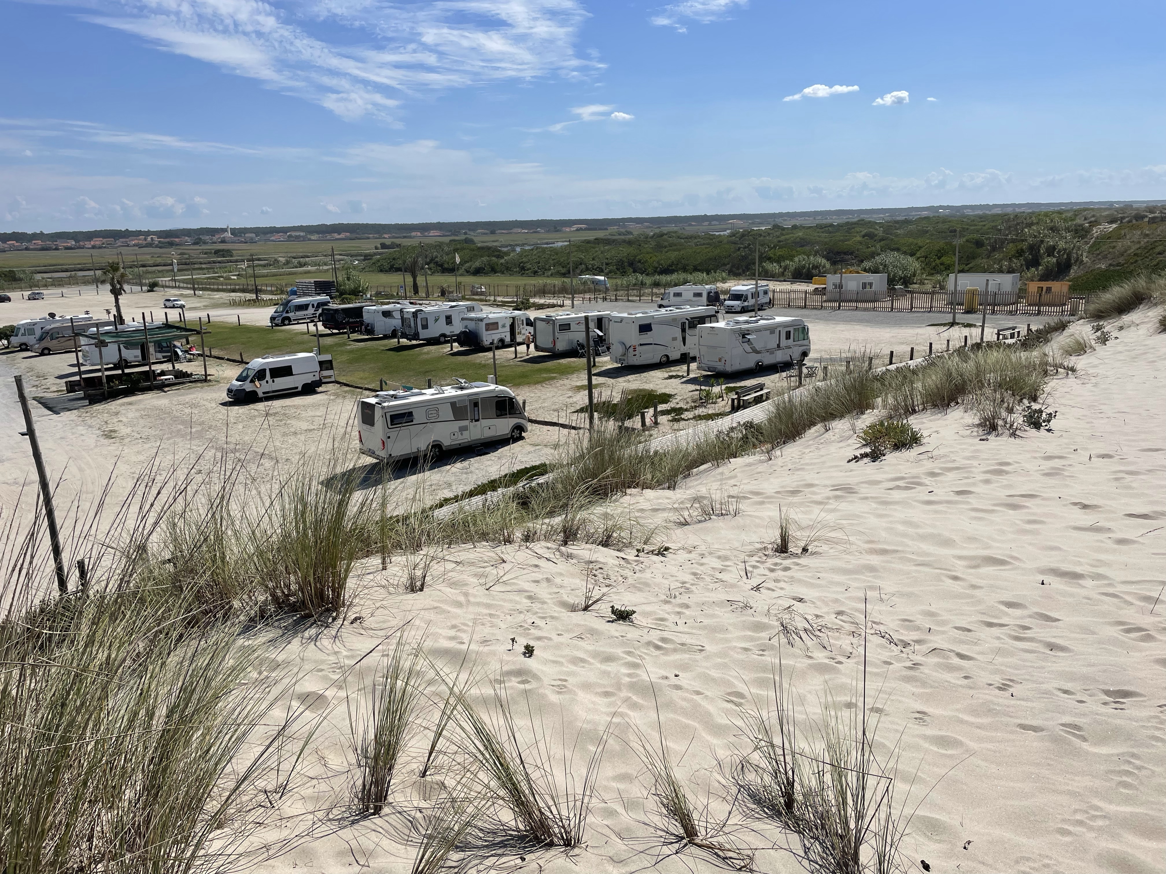 Unser Ziel, der Stellplatz bei Praia Vagueira, ist schnell erreicht und wir bekommen einen schönen großen Platz direkt an der Düne.