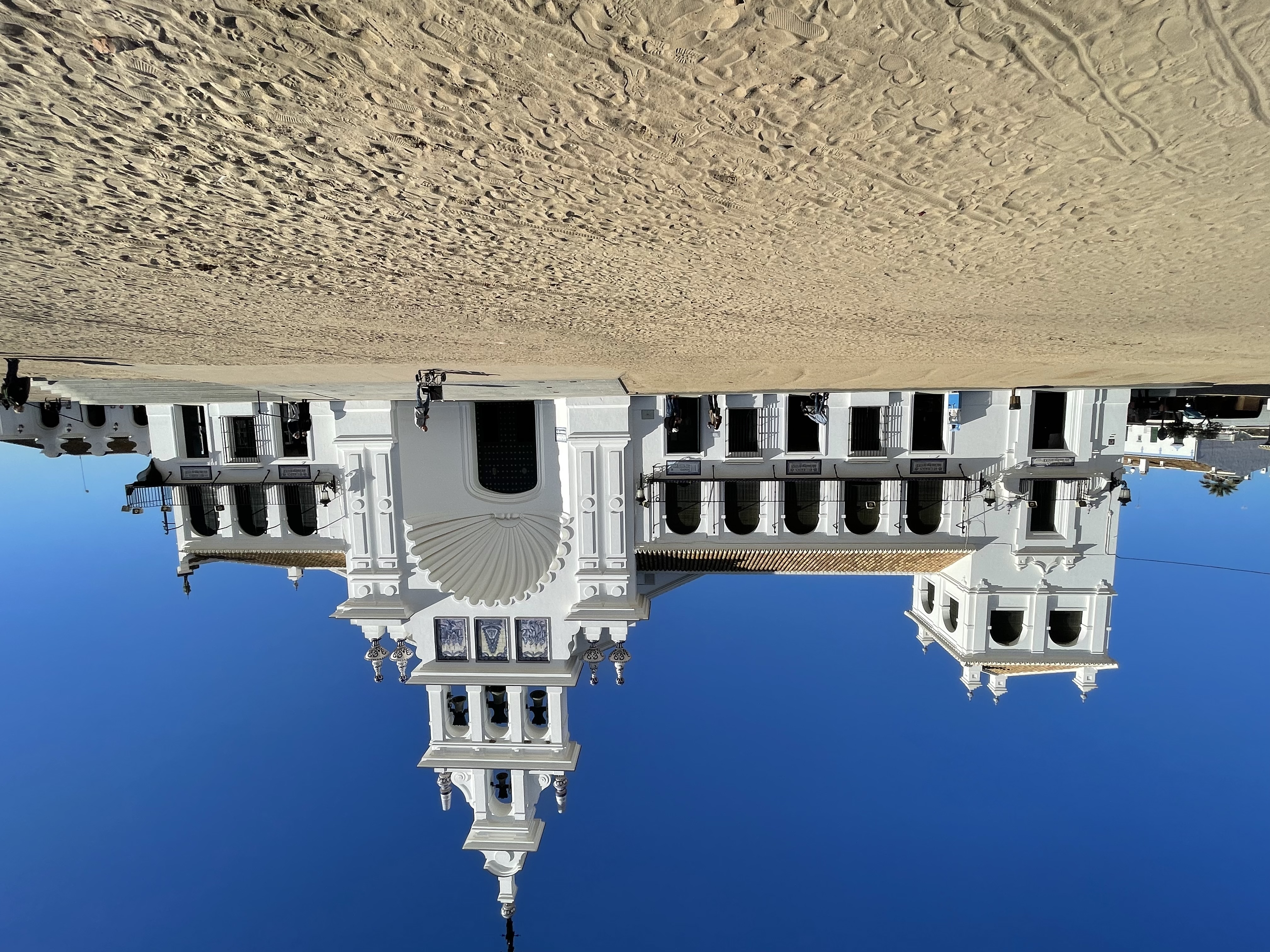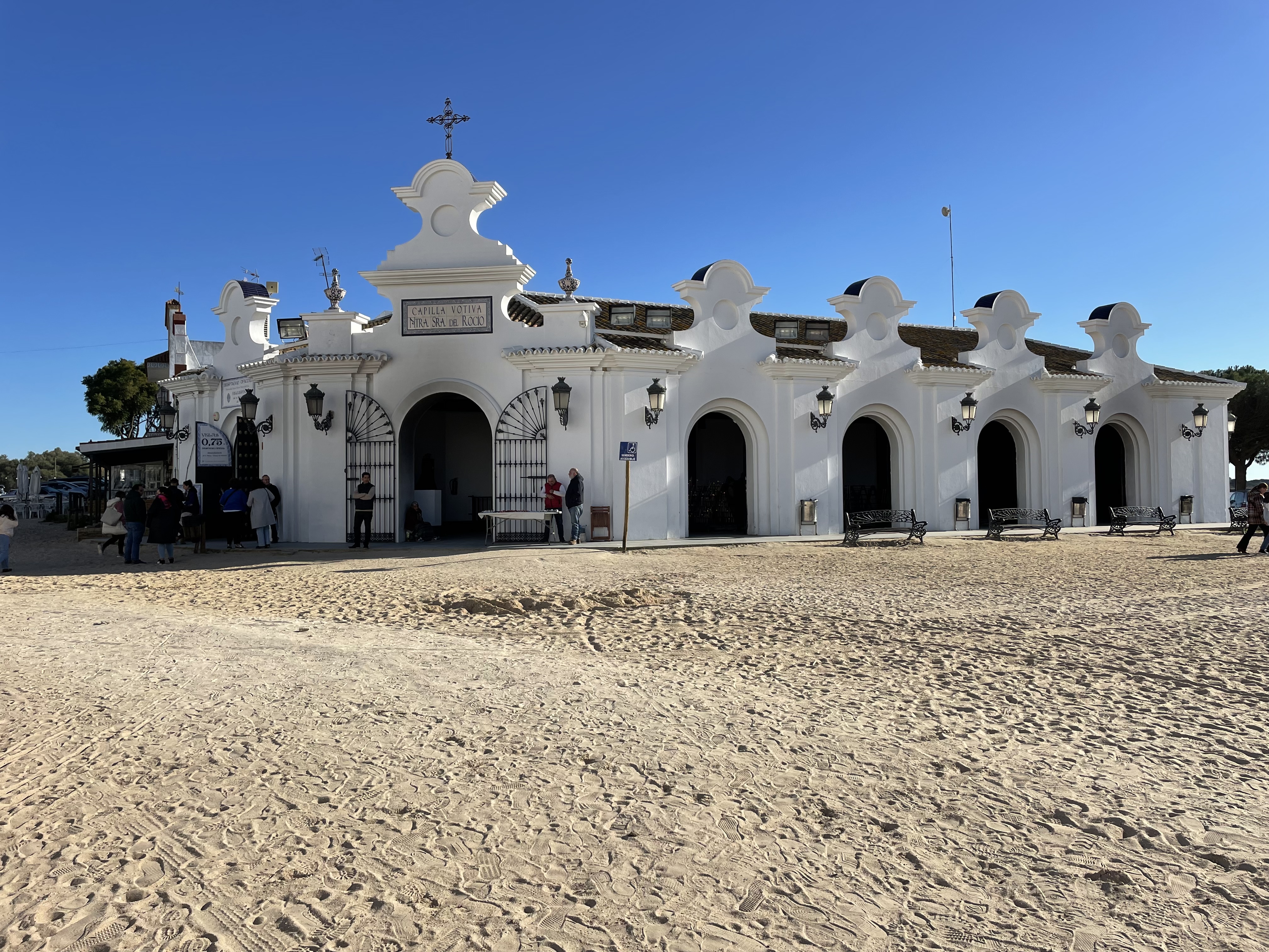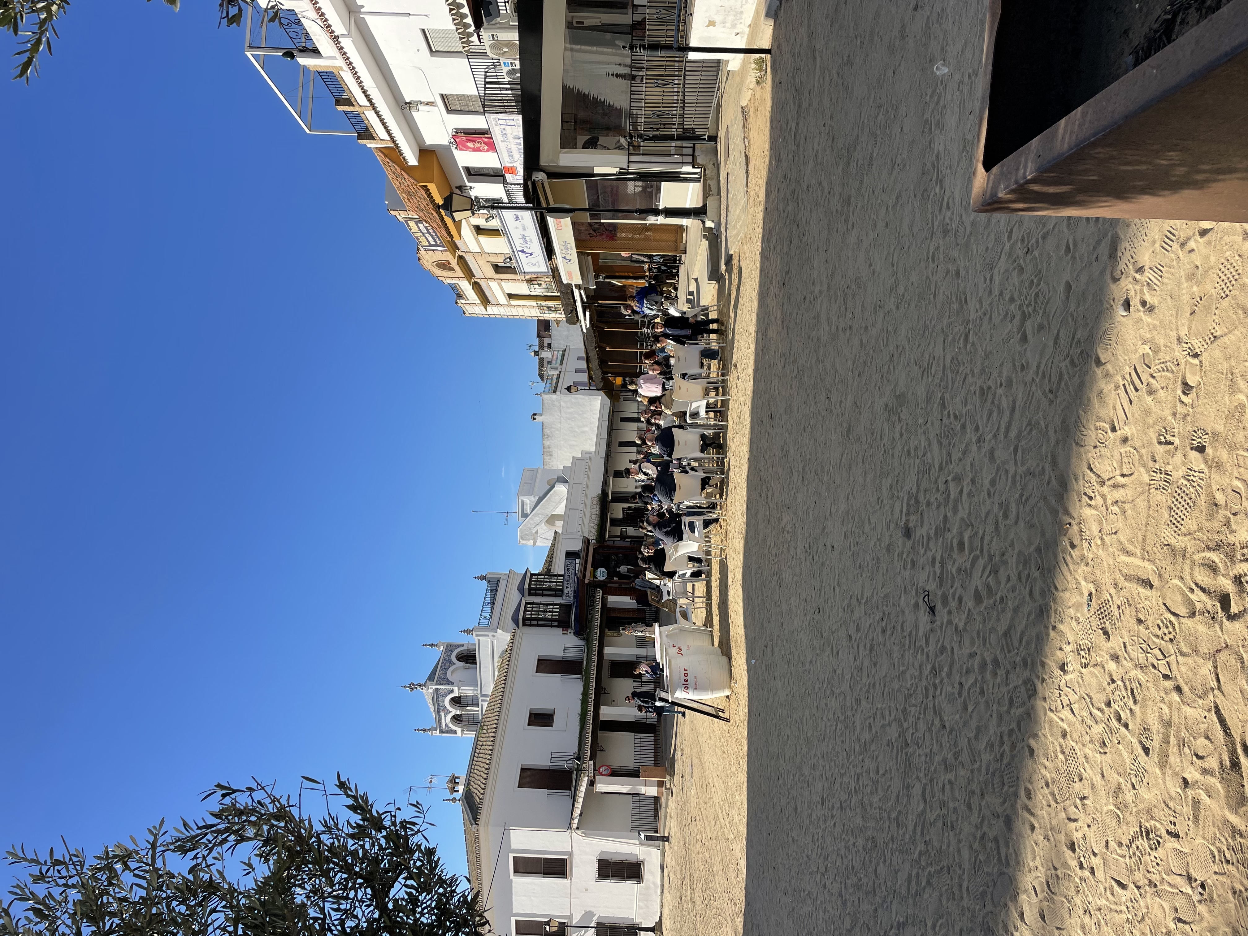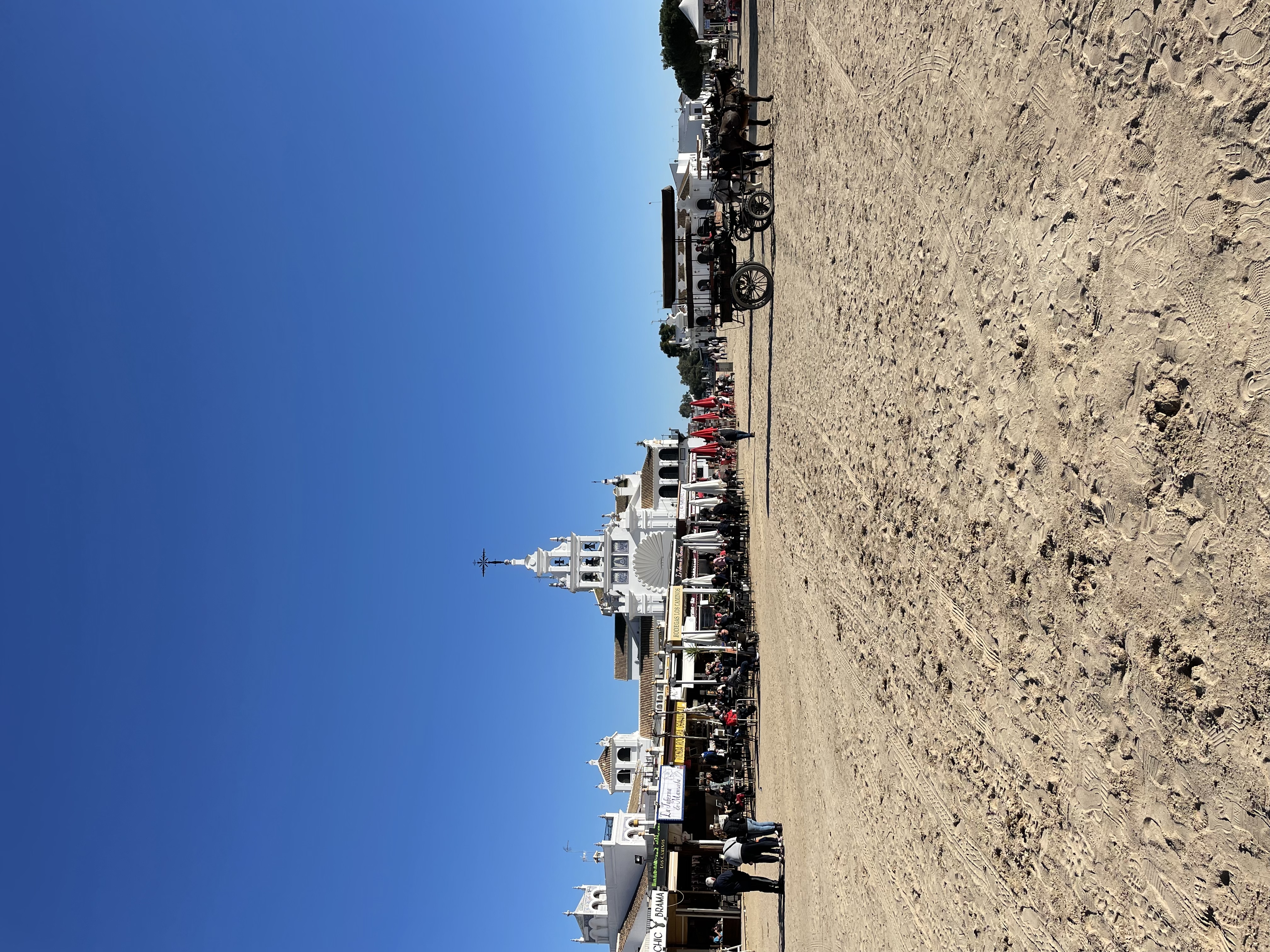 Auf diesem Stellplatz möchten wir nicht draußen sitzen, also fahren wir noch zum Wallfahrtsort El Rocío, der ganz in der Nähe liegt. Hier gibt es nur Sandstraßen und die Häuser erinnern an die alte Westernfilme.
